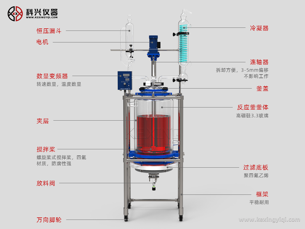 主要用于制藥、化工、實驗室等機構(gòu)的有機合成實驗室用中式設(shè)備,用于有機物合成實驗中,是生化制藥中的主要設(shè)備之一。釜體為雙層玻璃燒結(jié)而成,雙層之間可通過冷卻液和加熱液。釜底過濾篩板的設(shè)計,讓設(shè)備能承受100KG反應(yīng)液的壓力。過濾裝置采用法蘭和四氟材料制成與釜體相連,過濾器為玻璃砂芯,方便拆卸清洗更換。