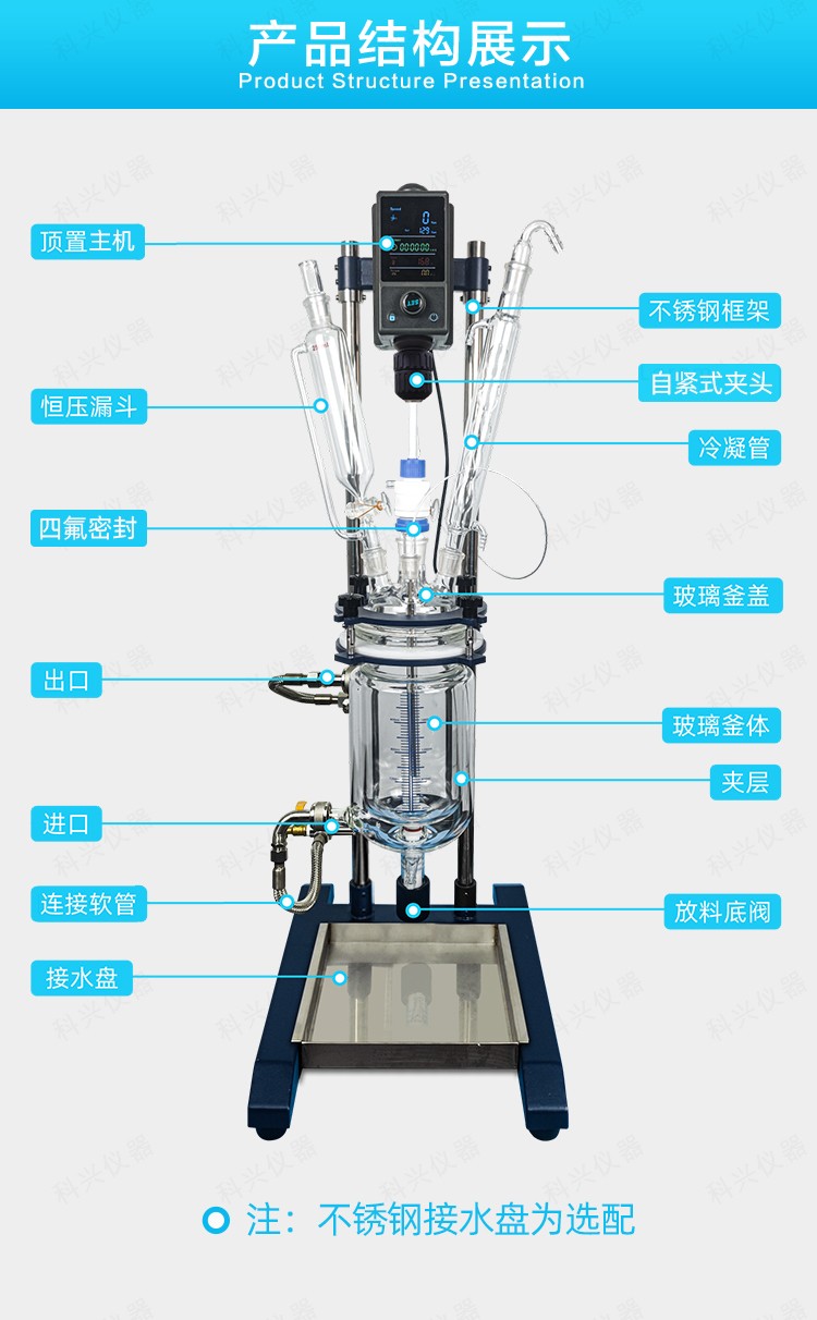 雙層玻璃反應釜為雙層玻璃設計,內層放入反應溶媒可做攪拌反應,夾層可通上不同的冷熱源(冷凍液,熱水或熱油)做高溫反應(配置相應的循環油浴鍋,溫度可以達到300℃)或低溫反應(配置相應的低溫冷凍液循環系統,溫度可以達到-80℃),也可選擇加熱制冷一體循環機;在設定恒溫條件下,在密閉的玻璃反應器內,可根據使用要求在常壓或負壓條件下進行攪拌反應,并能做反應溶液的回流與蒸餾,使用中可以抽成真空,從而做真空反應。是現代精細化工、生物制藥和新材料合成的理想中試、生產設備。它的這種設計使試驗更加的安全,更加的方便。